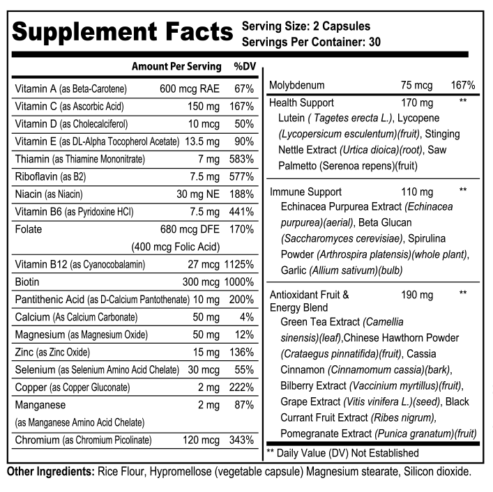 This nutrient-dense blend of Green Tea Extract, Chinese Hawthorn, Cinnamon, Bilberry, Grape Seed, Black Currant, and Pomegranate delivers natural energy and mental clarity while providing powerful antioxidant protection to support your body's daily balance and long-term wellness.